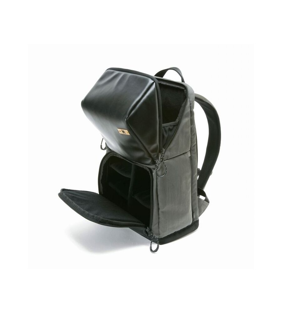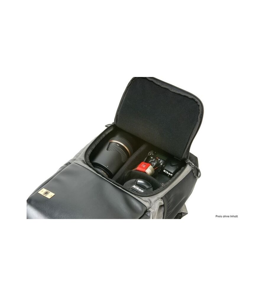 Fotorucksack mit zweiteiligem Aufbau. Oberteil mit zusätzlichem Innenfach für Daypack oder Kamera mit angesetztem Objektiv. Schneller Zugriff über Klappdeckel mit Zweiwege-Reißverschluss. Unterteil mit variablen Trennelementen für 2 bis 3 weitere Objektive, Blitzgerät oder Zweitgehäuse.