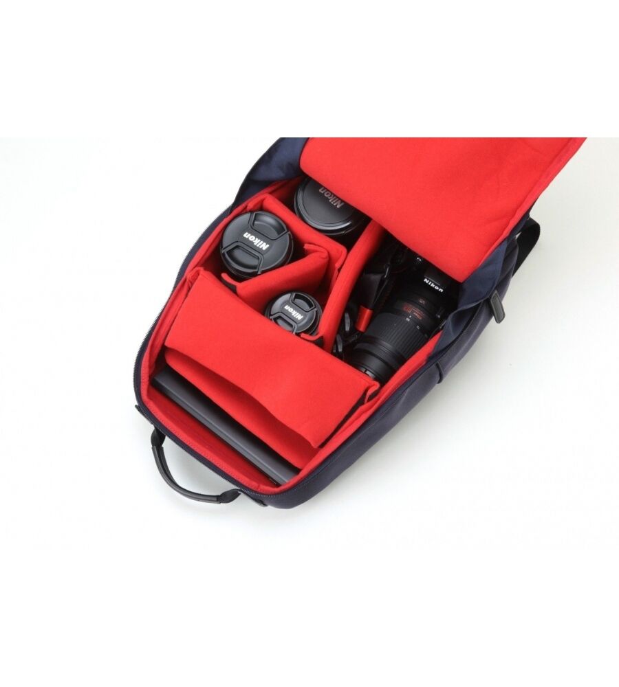Schlanker Rucksack mit Platz für eine DSLR oder eine spiegellose Systemkamera, jeweils mit angesetztem Standardobjektiv, weitere 3 Zusatzobjektive, ein 13“ Laptop sowie persönliche Utensilien.