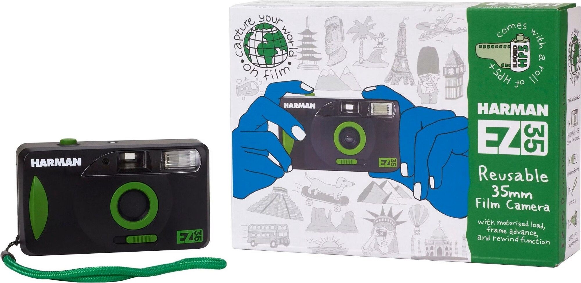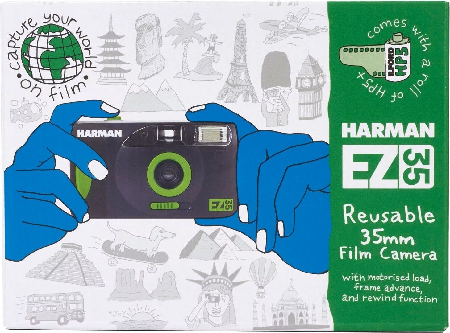 Die Harman EZ-35 ist eine wiederverwendbare 35mm Fotokamera mit motorisierter Lade-, Bildvorschub- und Rückspulfunktion. Damit ist sie die ideale Kamera für alle, die in die Filmfotografie einsteigen oder eine einfache Point-and-Shoot-Option suchen, um ihre Welt festzuhalten.