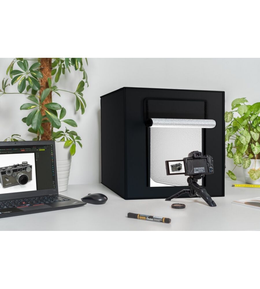 Das M80 II Lichtzelt von Newell ist eine hochwertige Studioausrüstung, die für professionelle Fotografie und Videoproduktion konzipiert wurde. Mit einer Leistung von 80W und einer maximalen Beleuchtungsstärke von 15000 LUX bietet dieses Lichtzelt eine hervorragende Lichtqualität, die für eine Vielzahl von Anwendungen geeignet ist. Die Farbtemperatur von 5500K sorgt für eine natürliche und ausgewogene Beleuchtung, die ideal für Produktaufnahmen ist. Das Lichtzelt hat kompakte Abmessungen von 84x84x84 cm und ist leicht mit einem Gewicht von etwa 5,2 kg, was den Transport und die Einrichtung erleichtert. Im Lieferumfang sind zwei LED-Paneele, drei Farb-Hintergründe (weiss, schwarz, orange), ein Mini-Stativ, eine Smartphone-Halterung, ein Netzadapter mit Lichtleistungsregulierung sowie eine praktische Tasche enthalten, die die Mobilität und Flexibilität bei der Nutzung unterstützt.