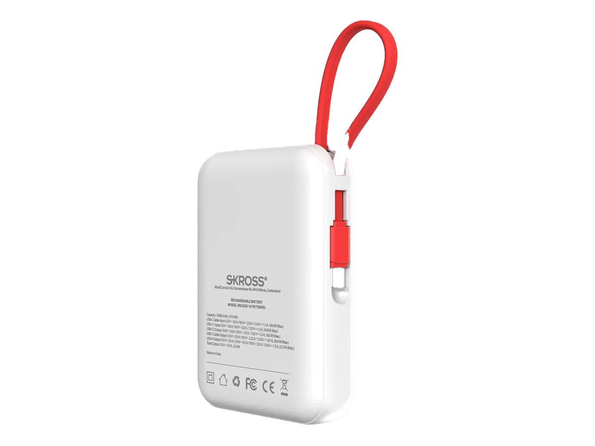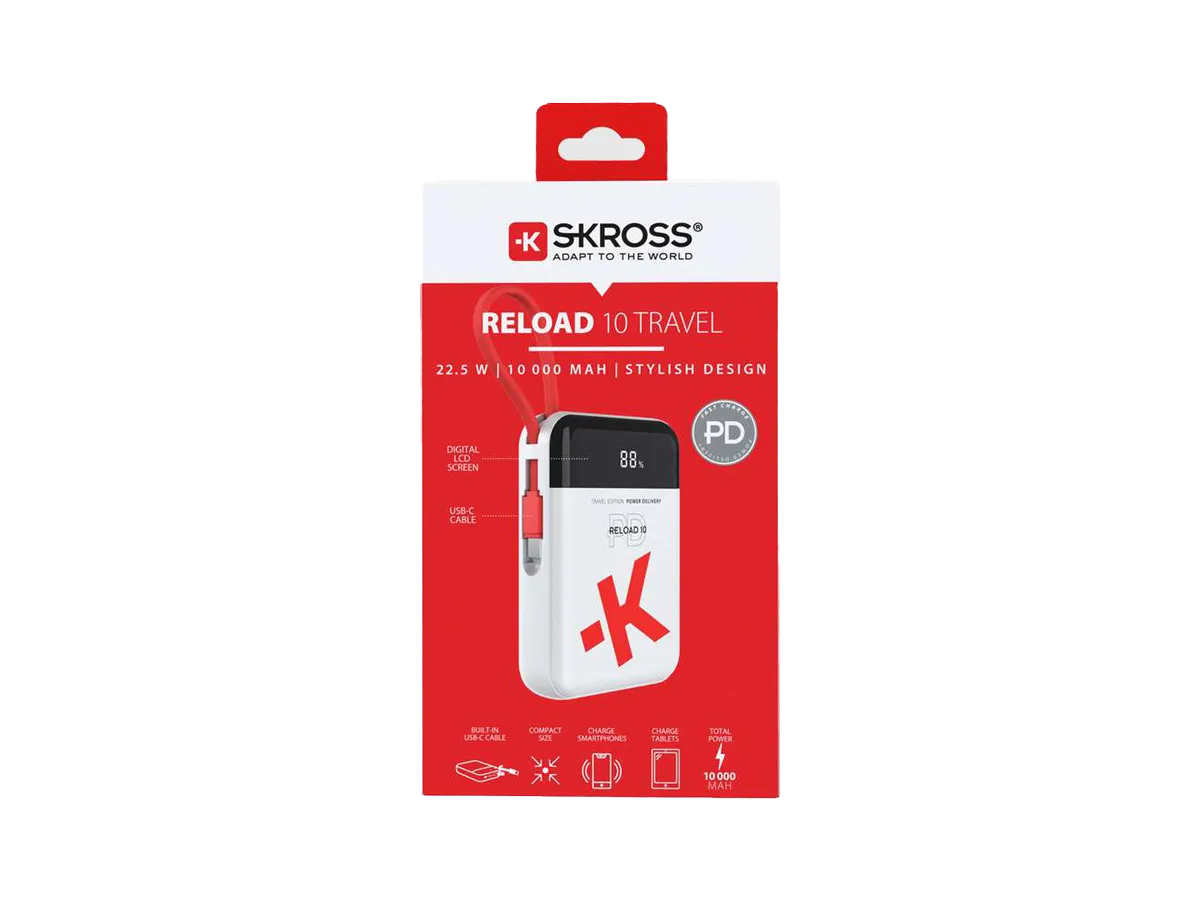 Die Powerbank RELOAD 10 Travel von SKROSS® mit Schnelladefunktion ist der perfekte Begleiter, wenn USB Geräte wie Handy, Tablet und Kamera unterwegs Energienachschub benötigen. Die Power Delivery Funktion (PD) bei allen USB-C Geräten sorgt in kürzester Zeit für volle Akkus. Zudem ist die Powerbank vorgeladen und somit sofort einsatzbereit. Integriertes USB-C Kabel, das gleichzeitig als Tragegriff dient.