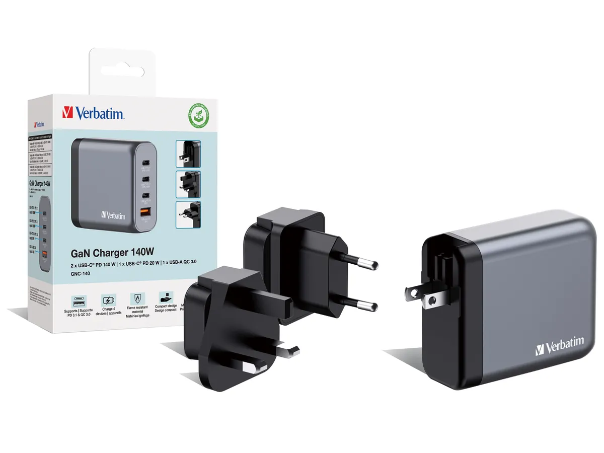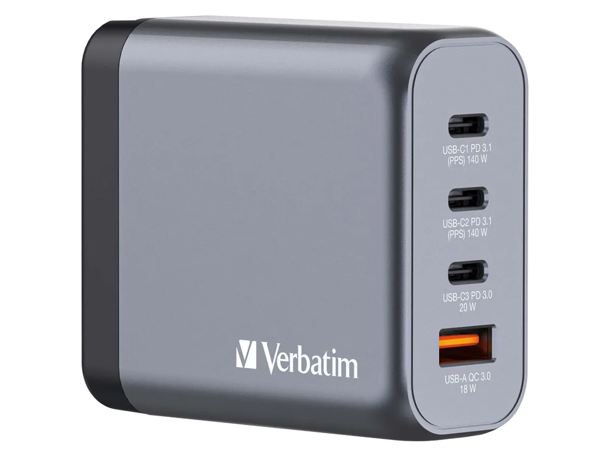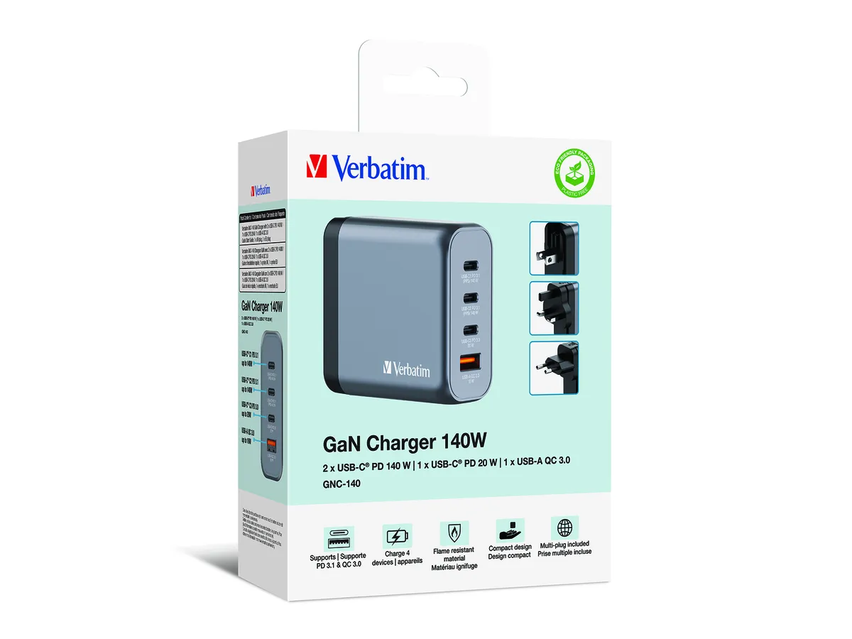 Im 140-W-GaN-Ladegerät von Verbatim sind zwei USB-C PD 140 W- Anschlüsse, ein USB-C PD 20 W-Anschluss und ein USB-A QC 3.0-Anschluss in einem schlanken, gerade handtellergroßen Design kombiniert. Dieses Ladegerät ist damit ideal zum Laden von Laptops, Tablets, Smartphones, Spielkonsolen usw. - im Büro, zu Hause oder unterwegs. Mit ausklappbaren US-Stiften und austauschbaren EU- und UK-Steckern ist dieses Ladegerät der perfekte Reisebegleiter. Die Galliumnitrat- (GaN-)Technik sorgt für schnelles, effizientes Laden mit hoher Leistung bei geringerer Wärmeentwicklung. Da GaN-Ladegeräte kleiner und leichter als herkömmliche Ladegeräte auf Silikon-Basis sind, sind sie extrem einfach zu transportieren und ideal für unterwegs. Das GaN-Ladegerät wird aus qualitativ hochwertigen, nicht entflammbaren Materialien hergestellt und ist mit vier Schutzsystemen ausgestattet: Überstromschutz, Überspannungsschutz, Kurzschlussschutz und Übertemperaturschutz. So sind Sie beim Laden sicher. - Plastikfreie Verpackung - PPS-Technologie (Programmable Power Supply, Programmierbare Stromversorgung) liefert genau die zum Laden optimale Strommenge - Unterstützt extrem schnelles Laden mit USB Power Delivery 3.0, PPS und Quick Charge 3.0 - Mit 2 x USB-C® PD 3.1 bis zu 140 W, 1 x USB-C PD 3.0 bis zu 20 W und 1 x USB-A QC 3.0 bis zu 18 W - Hervorragender Reisebegleiter durch ausklappbare US-Stifte und austauschbare EU- und UK-Stecker sowie schlankes, kompaktes Design - GaN-Technologie sorgt für effizientes Laden und eine geringere Wärmeerzeugung - Aus qualitativ hochwertigen, nicht entflammbaren Materialien hergestellt und mit vier Schutzsystemen ausgestattet: Überstromschutz, Überspannungsschutz, Kurzschlussschutz und Übertemperaturschutz - 4-in-1-Laden mit 140 W