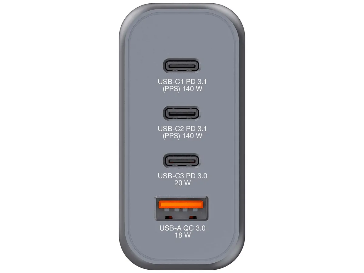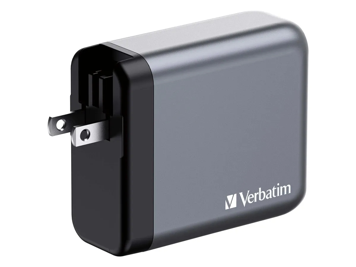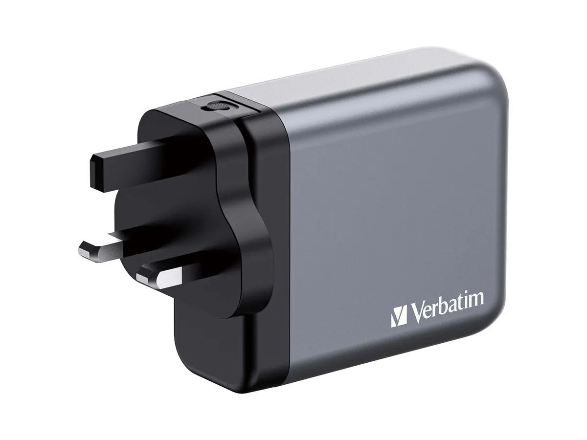 Im 140-W-GaN-Ladegerät von Verbatim sind zwei USB-C PD 140 W- Anschlüsse, ein USB-C PD 20 W-Anschluss und ein USB-A QC 3.0-Anschluss in einem schlanken, gerade handtellergroßen Design kombiniert. Dieses Ladegerät ist damit ideal zum Laden von Laptops, Tablets, Smartphones, Spielkonsolen usw. - im Büro, zu Hause oder unterwegs. Mit ausklappbaren US-Stiften und austauschbaren EU- und UK-Steckern ist dieses Ladegerät der perfekte Reisebegleiter. Die Galliumnitrat- (GaN-)Technik sorgt für schnelles, effizientes Laden mit hoher Leistung bei geringerer Wärmeentwicklung. Da GaN-Ladegeräte kleiner und leichter als herkömmliche Ladegeräte auf Silikon-Basis sind, sind sie extrem einfach zu transportieren und ideal für unterwegs. Das GaN-Ladegerät wird aus qualitativ hochwertigen, nicht entflammbaren Materialien hergestellt und ist mit vier Schutzsystemen ausgestattet: Überstromschutz, Überspannungsschutz, Kurzschlussschutz und Übertemperaturschutz. So sind Sie beim Laden sicher. - Plastikfreie Verpackung - PPS-Technologie (Programmable Power Supply, Programmierbare Stromversorgung) liefert genau die zum Laden optimale Strommenge - Unterstützt extrem schnelles Laden mit USB Power Delivery 3.0, PPS und Quick Charge 3.0 - Mit 2 x USB-C® PD 3.1 bis zu 140 W, 1 x USB-C PD 3.0 bis zu 20 W und 1 x USB-A QC 3.0 bis zu 18 W - Hervorragender Reisebegleiter durch ausklappbare US-Stifte und austauschbare EU- und UK-Stecker sowie schlankes, kompaktes Design - GaN-Technologie sorgt für effizientes Laden und eine geringere Wärmeerzeugung - Aus qualitativ hochwertigen, nicht entflammbaren Materialien hergestellt und mit vier Schutzsystemen ausgestattet: Überstromschutz, Überspannungsschutz, Kurzschlussschutz und Übertemperaturschutz - 4-in-1-Laden mit 140 W