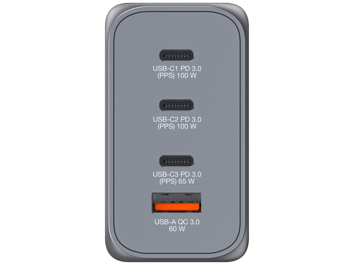 Im 200-W-GaN-Ladegerät von Verbatim sind zwei USB-C PD 100 W- Anschlüsse, ein USB-C PD 65 W-Anschluss und ein USB-A QC 3.0-Anschluss in einem schlanken, gerade handtellergroßen Design kombiniert. Dieses Ladegerät ist damit ideal zum Laden von Laptops, Tablets, Smartphones, Spielkonsolen usw. - im Büro, zu Hause oder unterwegs. Mit ausklappbaren US-Stiften und austauschbaren EU- und UK-Steckern ist dieses Ladegerät der perfekte Reisebegleiter. Die Galliumnitrat- (GaN-)Technik sorgt für schnelles, effizientes Laden mit hoher Leistung bei geringerer Wärmeentwicklung. Da GaN-Ladegeräte kleiner und leichter als herkömmliche Ladegeräte auf Silikon-Basis sind, sind sie extrem einfach zu transportieren und ideal für unterwegs. Das GaN-Ladegerät wird aus qualitativ hochwertigen, nicht entflammbaren Materialien hergestellt und ist mit vier Schutzsystemen ausgestattet: Überstromschutz, Überspannungsschutz, Kurzschlussschutz und Übertemperaturschutz. So sind Sie beim Laden sicher. - Plastikfreie Verpackung - PPS-Technologie (Programmable Power Supply, Programmierbare Stromversorgung) liefert genau die zum Laden optimale Strommenge - Unterstützt extrem schnelles Laden mit USB Power Delivery 3.0, PPS und Quick Charge 3.0 - Mit 2 x USB-C® PD 3.0 bis zu 100 W, 1 x USB-C PD 3.0 bis zu 65 W und 1 x USB-A QC 3.0 bis zu 60 W - Hervorragender Reisebegleiter durch ausklappbare US-Stifte und austauschbare EU- und UK-Stecker sowie schlankes, kompaktes Design - GaN-Technologie sorgt für effizientes Laden und eine geringere Wärmeerzeugung - Aus qualitativ hochwertigen, nicht entflammbaren Materialien hergestellt und mit vier Schutzsystemen ausgestattet: Überstromschutz, Überspannungsschutz, Kurzschlussschutz und Übertemperaturschutz - Drahtloses 4-in-1-Laden mit 200 W