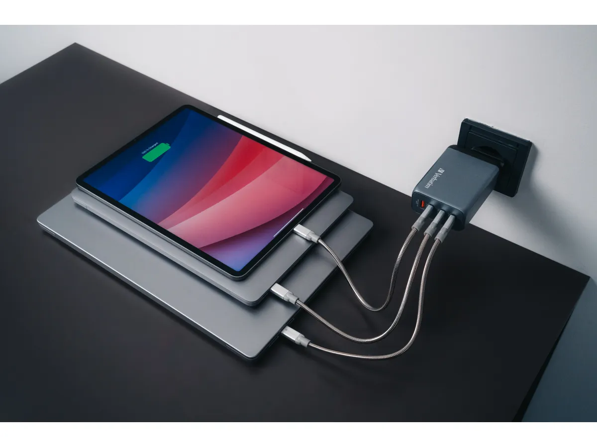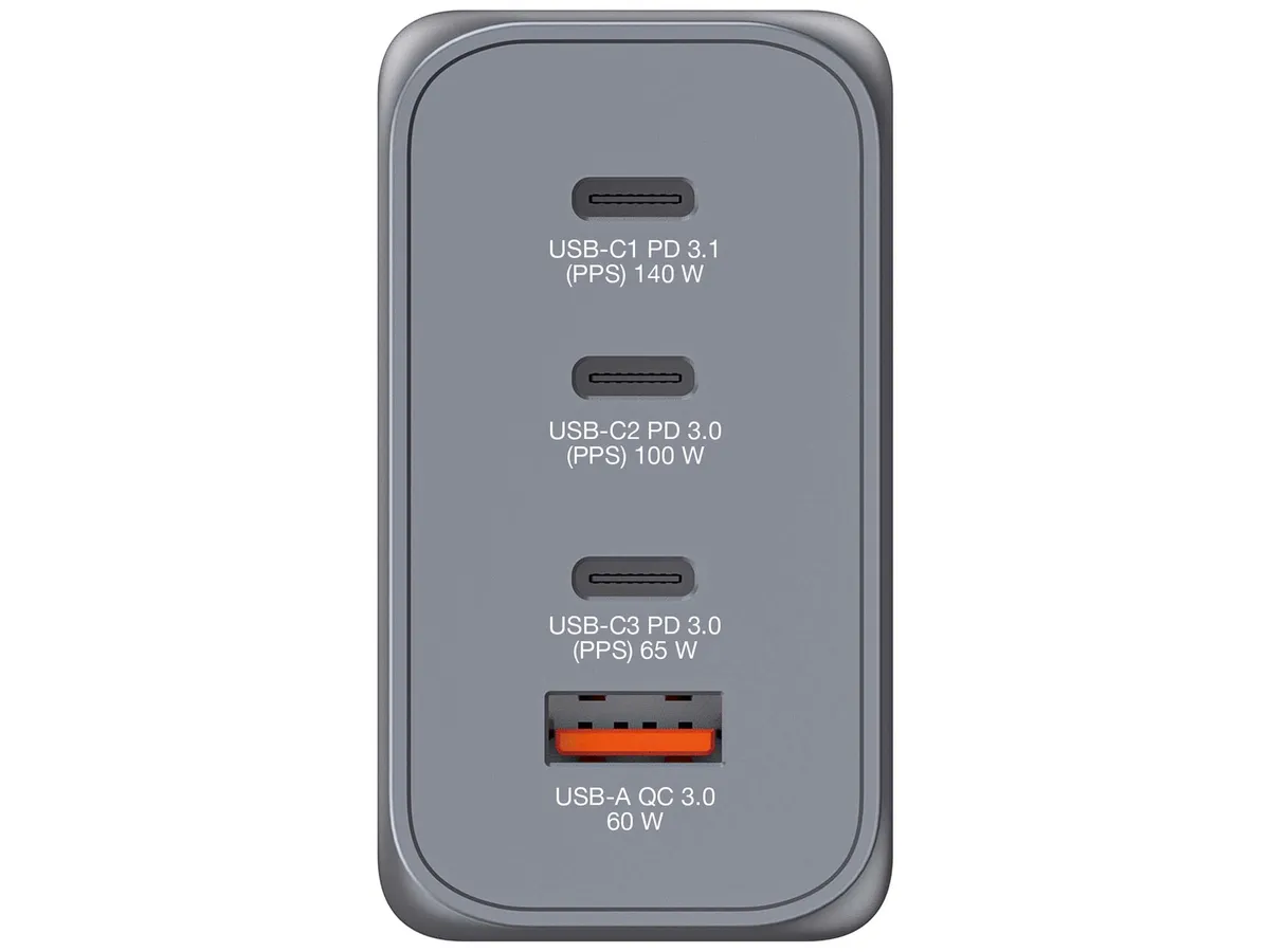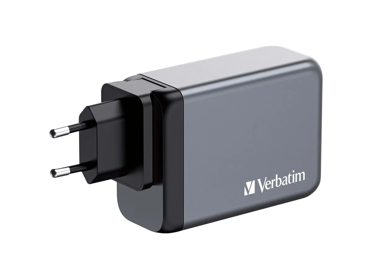 Im 240-W-GaN-Ladegerät von Verbatim sind ein USB-C PD 140 W-Anschluss, ein USB-C PD 100 W-Anschluss, ein USB-C PD 65 W-Anschluss und ein USB-A QC 3.0-Anschluss in einem schlanken, gerade handtellergroßen Design kombiniert. Dieses Ladegerät ist damit ideal zum Laden von Laptops, Tablets, Smartphones, Spielkonsolen usw. im Büro, zu Hause oder unterwegs. Mit ausklappbaren US-Stiften und austauschbaren EU- und UK-Steckern ist dieses Ladegerät der perfekte Reisebegleiter. Die Galliumnitrat-(GaN-)Technik sorgt für schnelles, effizientes Laden mit hoher Leistung bei geringerer Wärmeentwicklung. Da GaN-Ladegeräte kleiner und leichter als herkömmliche Ladegeräte auf Silikon-Basis sind, sind sie extrem einfach zu transportieren und ideal für unterwegs. Das GaN-Ladegerät wird aus qualitativ hochwertigen, nicht entflammbaren Materialien hergestellt und ist mit vier Schutzsystemen ausgestattet: Überstromschutz, Überspannungsschutz, Kurzschlussschutz und Übertemperaturschutz. So sind Sie beim Laden sicher. - Plastikfreie Verpackung - PPS-Technologie (Programmable Power Supply, Programmierbare Stromversorgung) liefert genau die zum Laden optimale Strommenge - Unterstützt extrem schnelles Laden mit USB Power Delivery 3.1 und 3.0, PPS und Quick Charge 3.0 - Mit 1 x USB-C® PD 3.1 bis zu 140 W, 1 x USB-C® PD 3.0 bis zu 100 W, 1 x USB-C PD 3.0 bis zu 65 W und 1 x USB-A QC 3.0 bis zu 60 W - Hervorragender Reisebegleiter - durch ausklappbare US-Stifte und austauschbare EU- und UK-Stecker sowie schlankes, kompaktes Design - GaN-Technologie sorgt für effizientes Laden und eine geringere Wärmeerzeugung - Aus qualitativ hochwertigen, nicht entflammbaren Materialien hergestellt und mit vier Schutzsystemen ausgestattet: Überstromschutz, Überspannungsschutz, Kurzschlussschutz und Übertemperaturschutz - Drahtloses 4-in-1-Laden mit 240 W